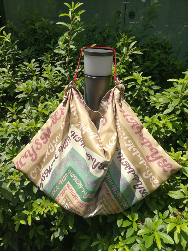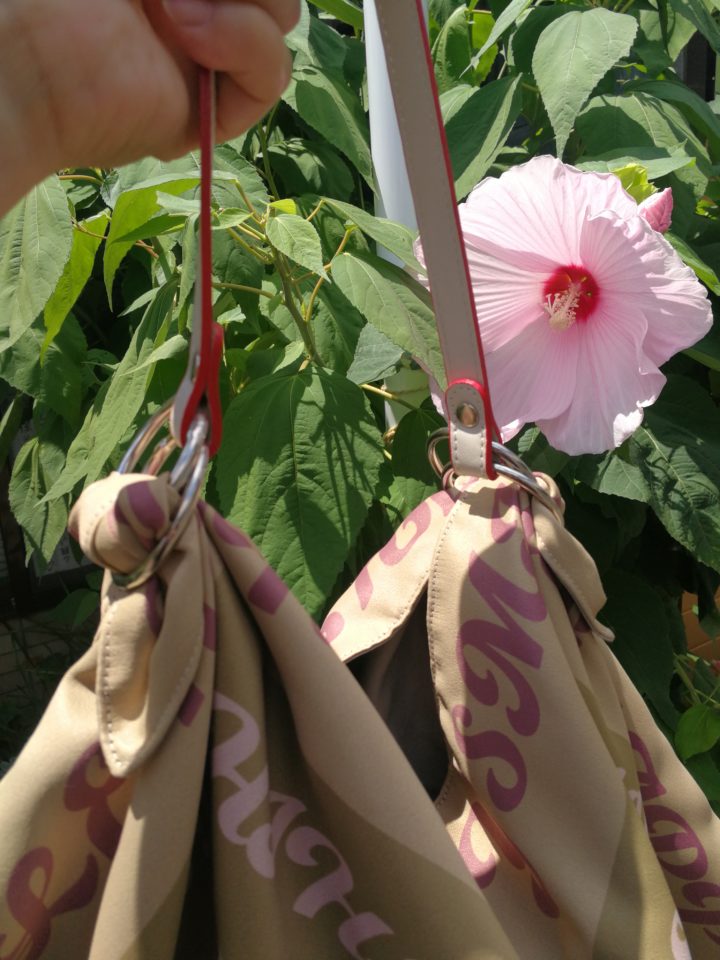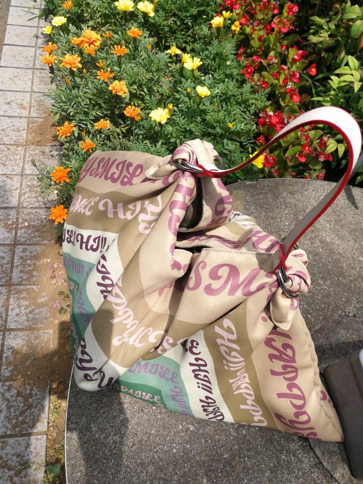 太陽の下歩くときには帽子をかぶりたくなりますよね。パネル柄ビッグバッグは帽子も入れたり、折り畳んで2つ持ちバッグとしても使えます!