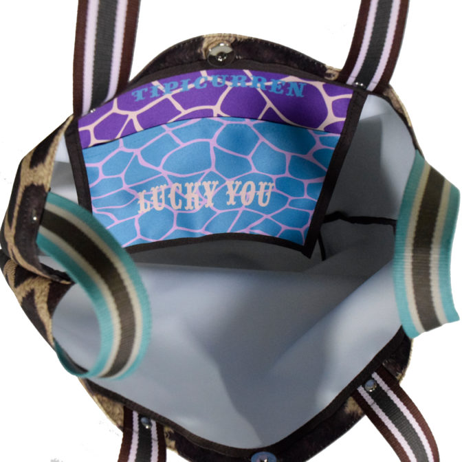 間口はマグネットで止められます。1枚仕立てですので内側に19cm×15cmの吊りポケットを付けています。ちょっと派手めなプリントに”LUCKY YOU”の幸せワードに願いを込めてます。