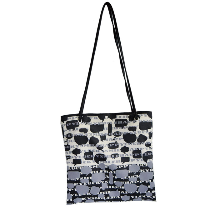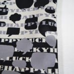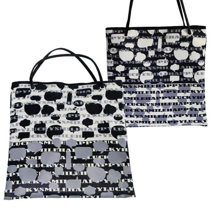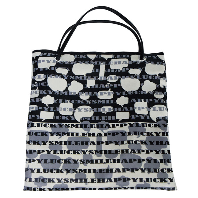 サテン素材にプリントすることで革にも近い表情があり、吹き出し柄が面白い表情を出し、HAPPYLUCKYSMILEの幸せワード総柄で楽しくなります。