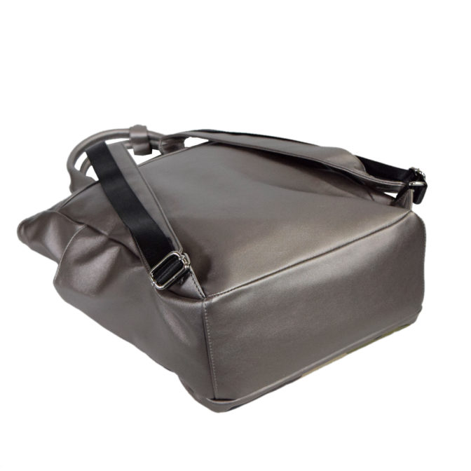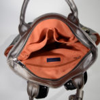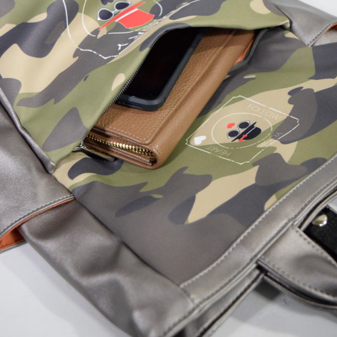 なんにでも合わせやすい合成皮革のメタリックなガンメタカラーに、ポリエステルのダブルスエード生地にカモフラージュプリント、帽子とサングラスの紳士と淑女をプリントしカジュアルダウンさせた、大人かわいいアイキャッチ抜群のバッグです。