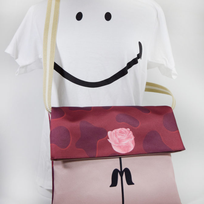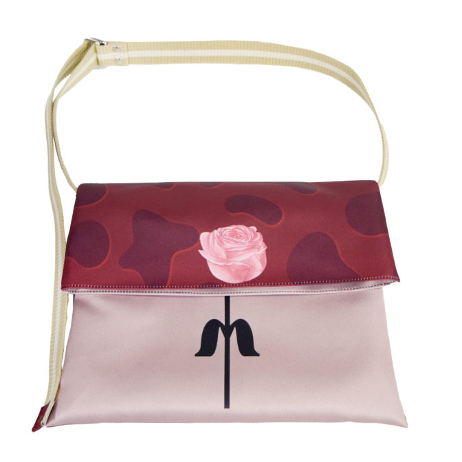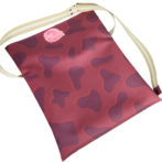 横幅31cm×高さ38cmの縦長スタイルを2つ折りにし大きめのクラッチバッグのデザインに、150cmのベルトを付けてワンショルダーから斜めがけまで対応できるデザインに仕上げています。