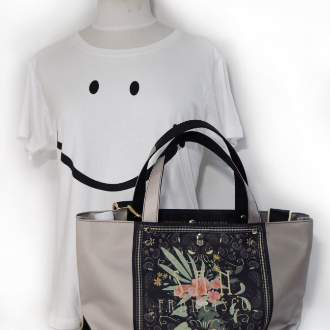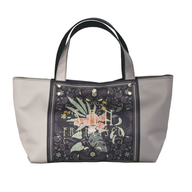 中央部はブラックベースにSANFRANCISCOスカーフ柄に花束プリントを施して、華やかな印象を与えて、落ち着いた配色でエレガントな仕上がりです。