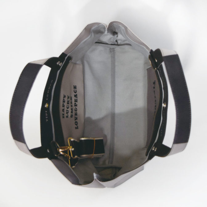 バッグを開けると色遣いの多さと、幸せワードがプリントされたポケットが楽しい気分にさせてくれます。