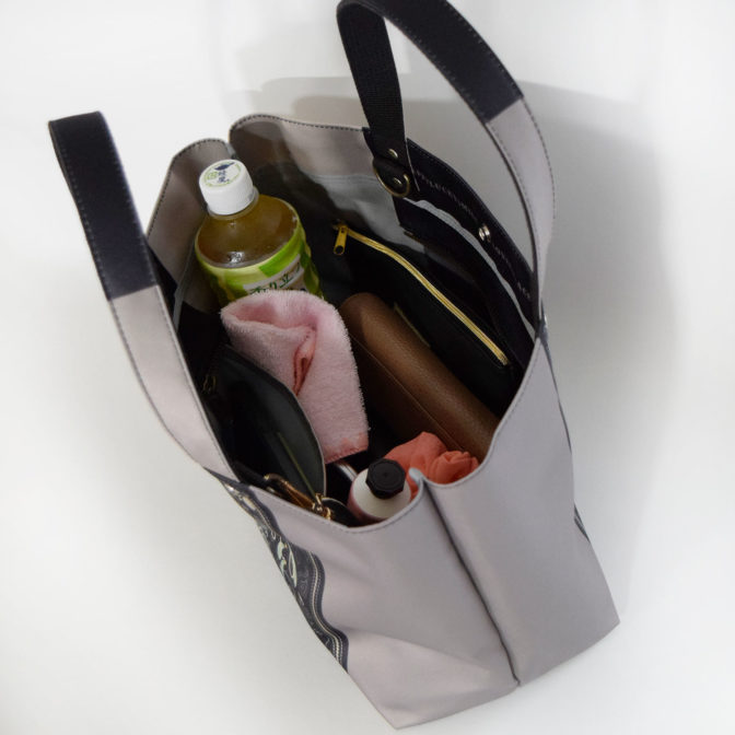 オープンファスナーを閉めても開口部42cmありますので、左右に500mlのペットボトルも入ります。収納力は抜群でバッグ本体も300gと軽く、持ち手も広くとっていますのでワンショルダーとしても使えます。
