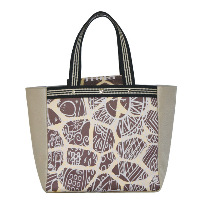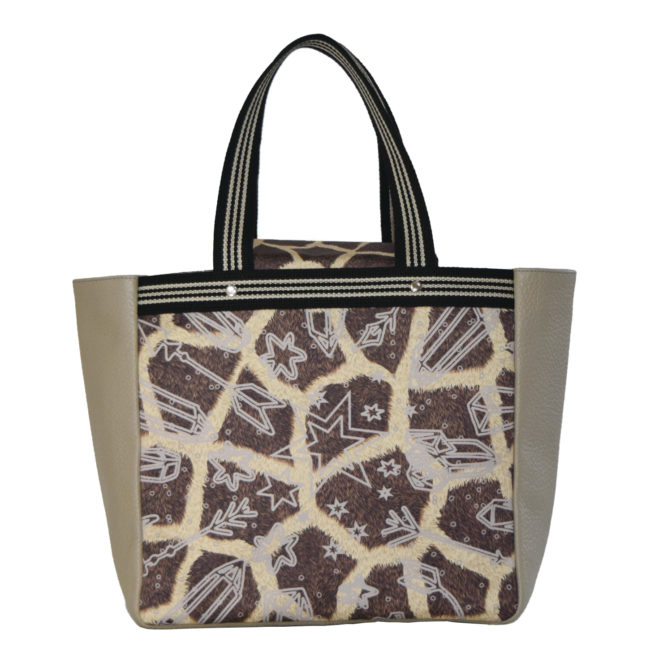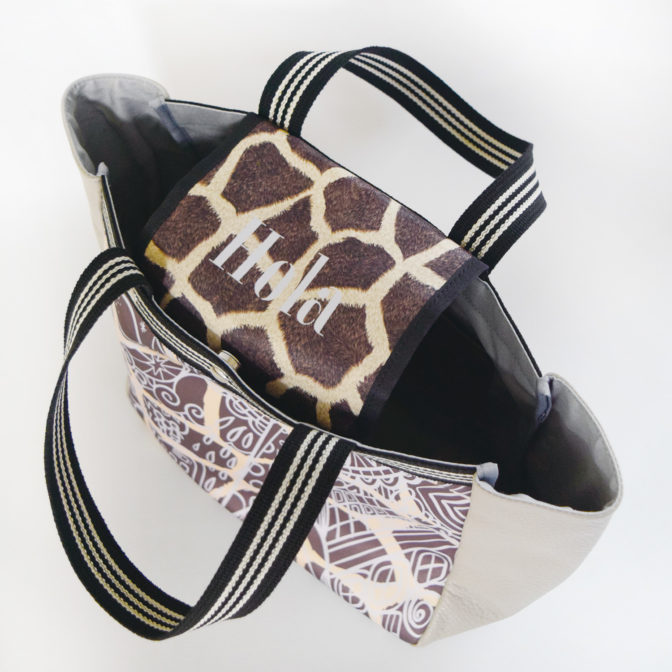 おしゃれなトープ色で、傷のつきにくい牛革のシュリンクは高級感もあり、両面にジラフプリントの遮光スエードが本物感を出しながら高級感をプラスしています。底マチも広くいっぱい入るデザインですので、中の荷物を少しでも隠せるようにフラップをつけています。マグネット止めで、ワンポイントにHolaプリントをプラスしてます。