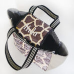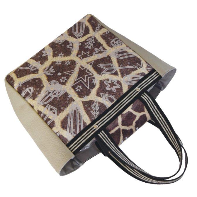 ティピィカレン牛革フラップ付きジラフプリントトートバッグ。