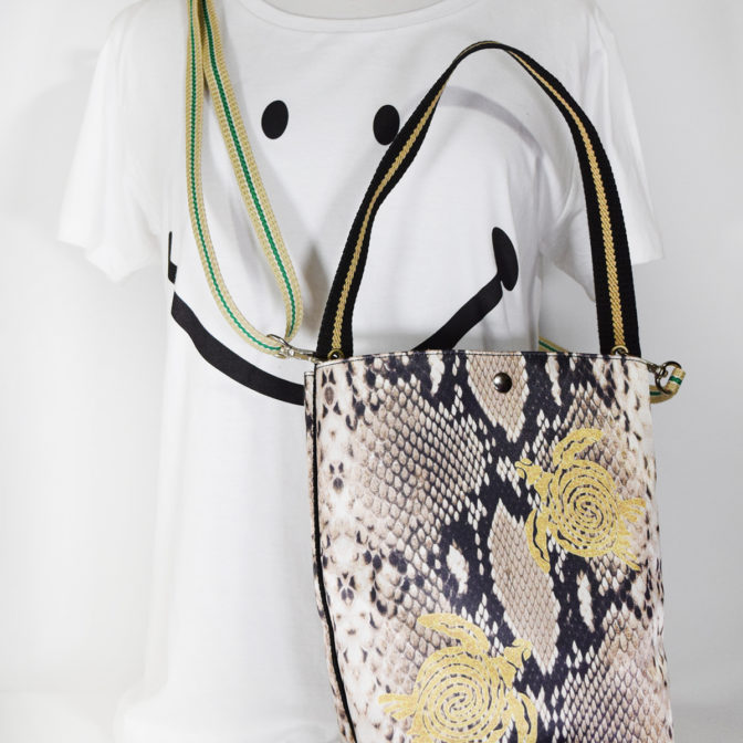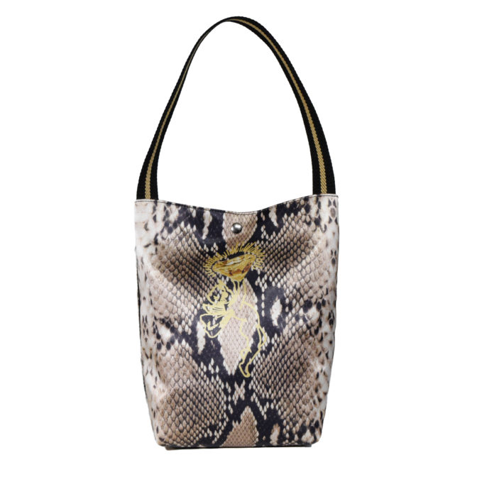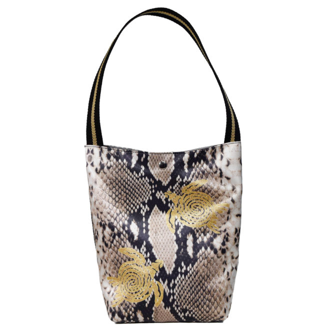スネークプリントをベースに、片面に海の神様、幸せを呼ぶものとされるウミガメ(ホヌ)を、もう片面はエンジェルがゴールドの宝石を持ち上げるところを、幸せの願いを込めたプリントを施しています。