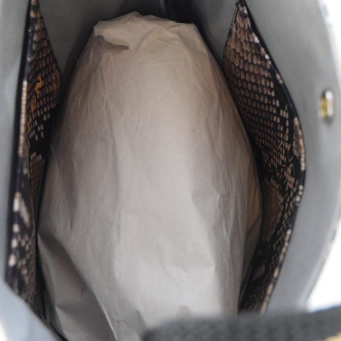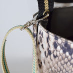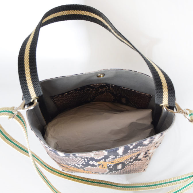 98cmのラインテープをぐるりと使い、10cm底マチをつけたことで自立するバッグになりました。シンプルなつくりですが、少し縦長のきれいなバケット型のフォルムを出すことができました。
