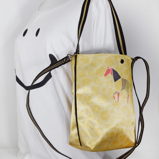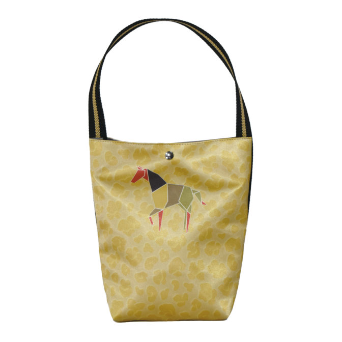 ゴールドのベースにレオパードのプリントをし、片面に折り紙風のホースプリント、もう片面には、HOLAのラメ風プリントでワンポイントデザインをしています。