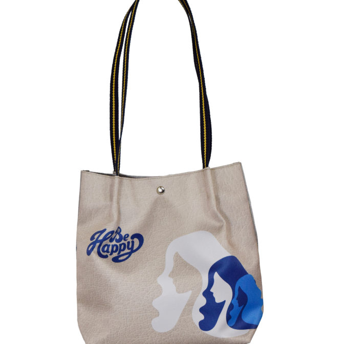 裏地はコットンで切ポケットを2個付け、幸せワードプリントし楽しくなるバッグを目指してます。開口部はマグネットホック止めになります。