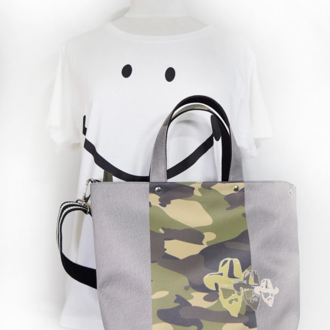 グレーベージュベースにシュリンク加工に見えるグラフィックを加えて、質感が革のような表情を持っています。中央部分はカモフラージュ柄に、片面はMENSフリーマン、もう片面は、LADYSのフリーマンを同系色でデザインしました。