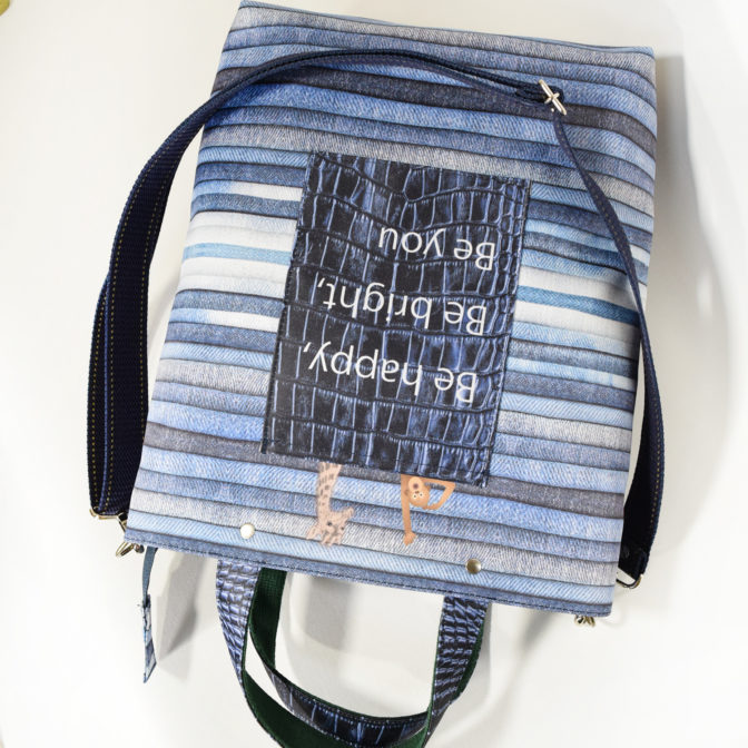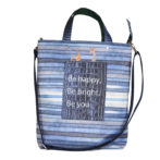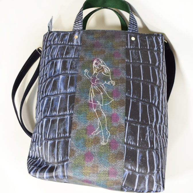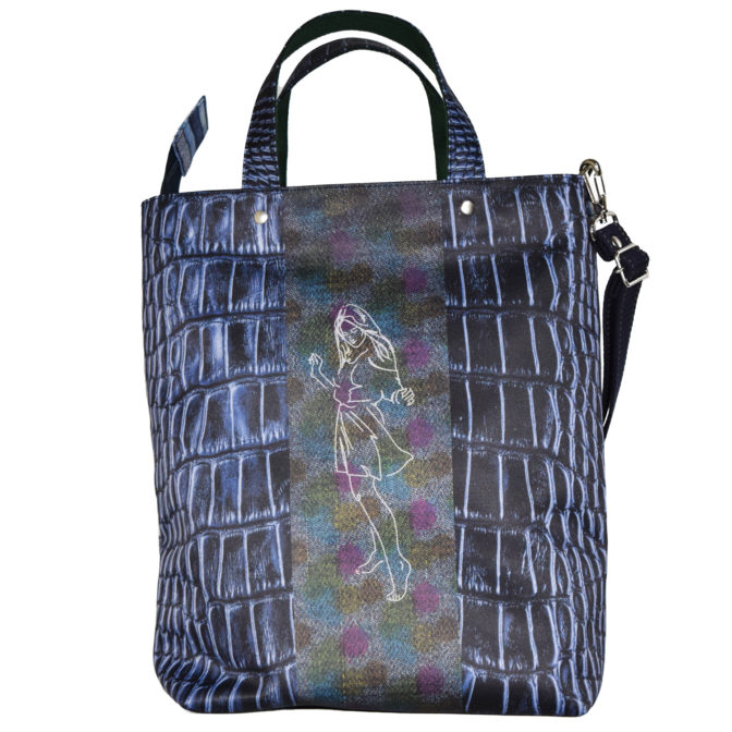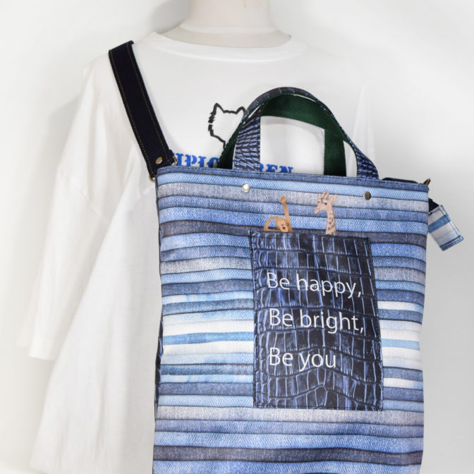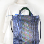 ティピィカレンのデニムとブルークロコ風の両面柄の縦長2WAYトートバッグ。