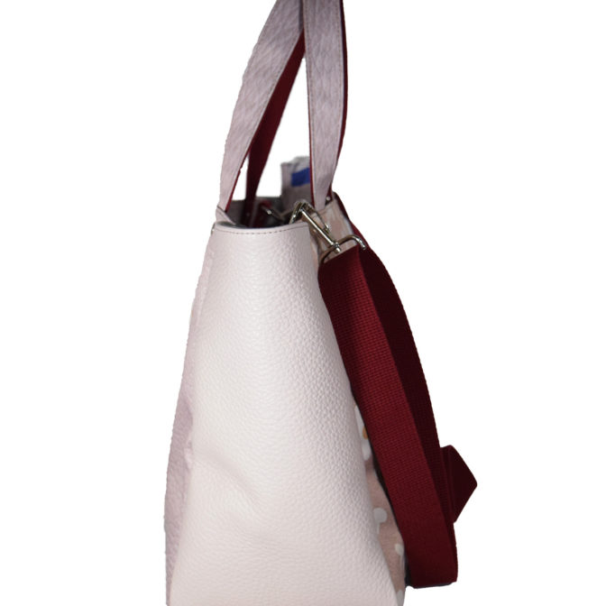 このトートバッグは、手持ちだけでなく、ショルダーベルトも付いているので、斜め掛けもでき様々なシーンに対応できます。