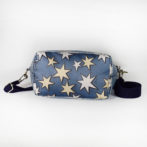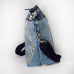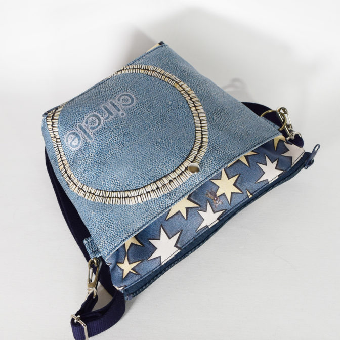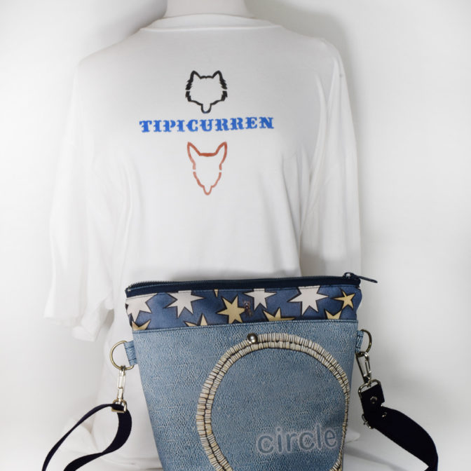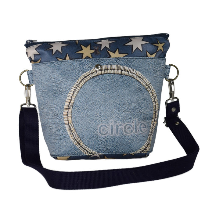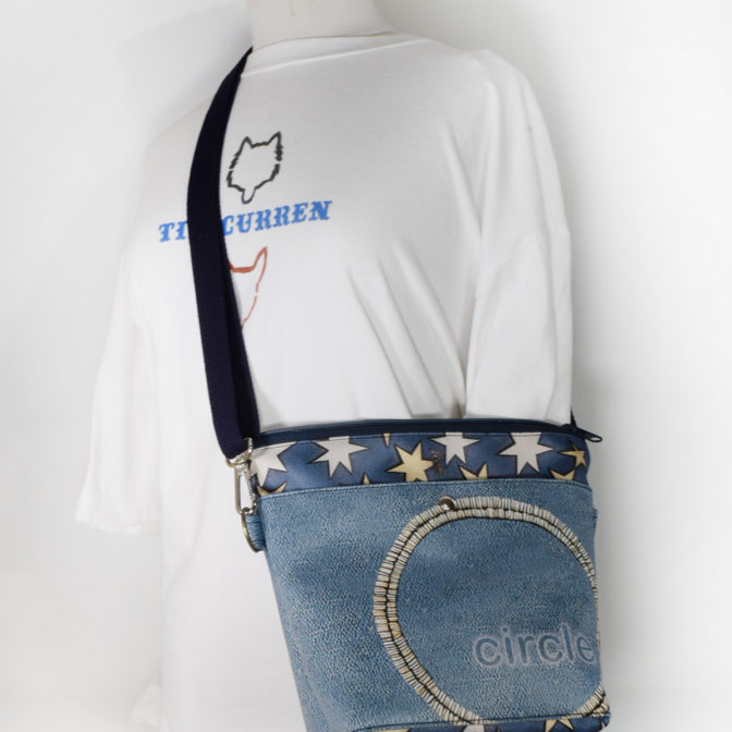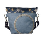 表面はブルーのクラックう風の革ベースにサークル刺繍加工をモチーフに、本体部分はデニム風素材星柄をちりばめ、犬や猫を小さくポイントに差し込んで、なんか楽しくなる、軽くて便利そんなバッグに仕上がっています。