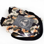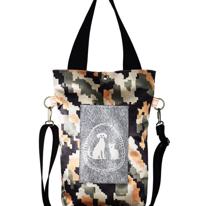 表は茶系のカモフラージュにハートモチーフの刺繍柄、裏は変わりカモフラージュに犬猫刺繍をポケットにしています。