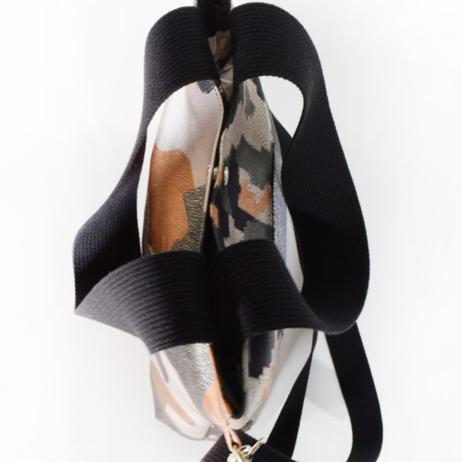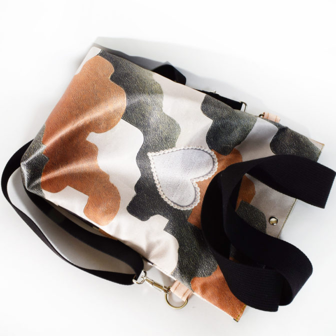 サテンスエードのポリエステル素材は、中肉素材で、硬さもあり丈夫で、軽さを追求しています。光沢のある特徴をデジタル染色でオリジナル柄を施していますので、他にない高級感とユニークなバッグになっています。
